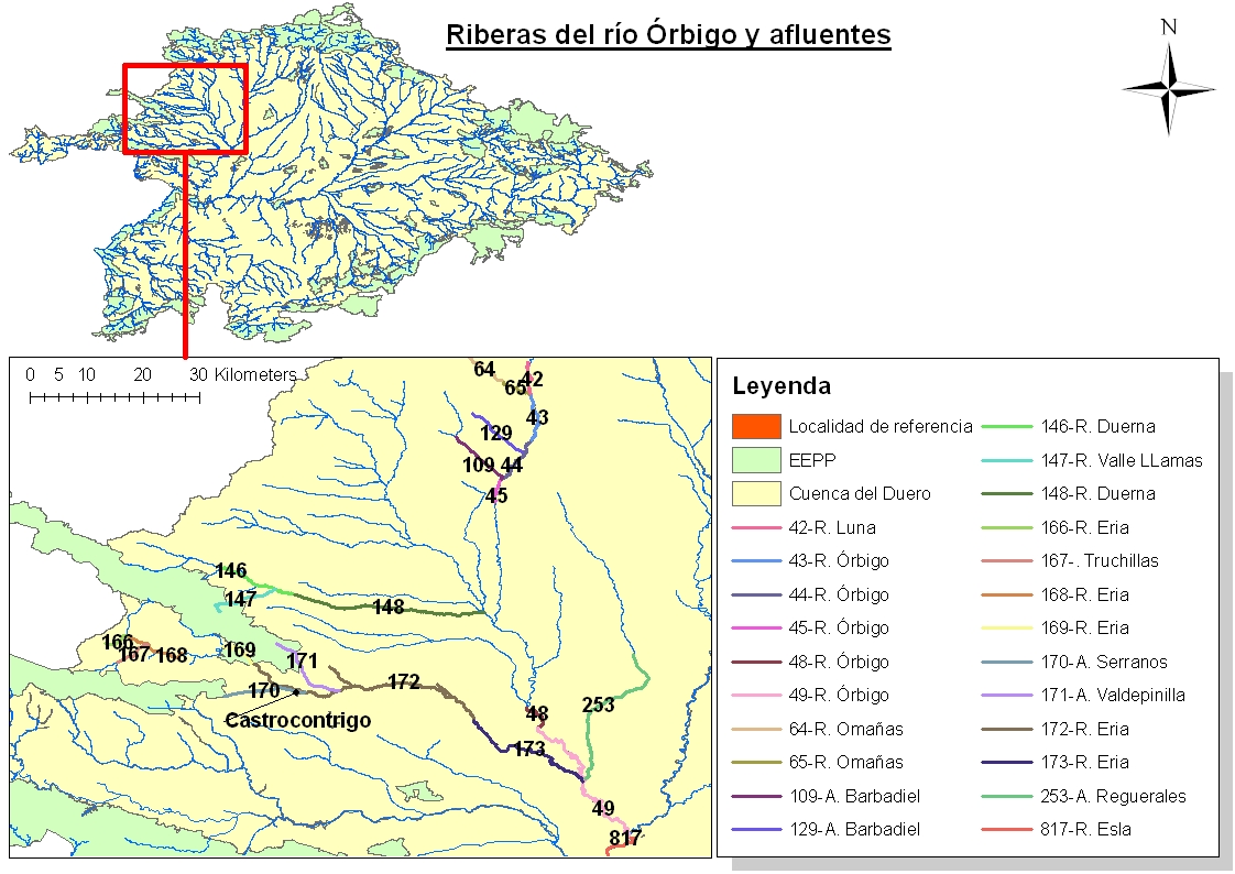 La superficie englobada la define el cauce del río más una anchura en cada margen a lo largo de todos los tramos. Esta anchura es de 25 m. en el caso del río Duerna y en uno de los dos tramos de los otros dos ríos (Órbigo y Eria), y es de 10 m. en los otros dos tramos de los ríos Órbigo y Eria (tramos más bajos). El Lugar incluye por tanto varios tramos fluviales que cuentan con buenas poblaciones de distintas especies de peces continentales. El corredor fluvial protegido está interrumpido, y forma cuatro segmentos separados. La cabecera de dos de los afluentes el Duerma y el Eria, un tramo medio del Eria que llega casi hasta su desembocadura en el Órbigo, y dos tramos de este río uno al norte entre Las Omañas hasta Armellada, y un tramo final del Órbigo hasta casi su llegada al Esla en Benavente.