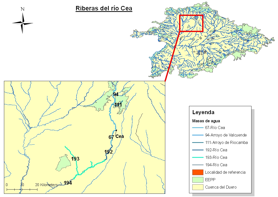 La superficie englobada la define el cauce del río más una anchura de 25 m. en cada margen a lo largo de los tramos. Los tramos de la zona propuesta presentan un buen estado de conservación. Presencia de Lutra lutra. La vegetación del río Cea supone una verdadera isla en la extensa campiña ocupada fundamentalmente por cultivos herbáceos de secano. Podemos dividir este Espacio en dos partes, una inicial situada entre Gordoncillo y Melgar de arriba y otra más aguas arriba situada entre Sahagun y Mondeganes. El corredor fluvial protegido, está interrumpido, y forma dos partes separadas, no se incluye ningún afluente. La parte de cabecera contacta con el Espacio Rebollares del Cea, después existe un tramo sin protección y el nacimiento de este río se adentrar en el Espacio Picos de Europa, en cuento a la parte baja del río, también hay un tramo sin protección que corresponde a la masa 195 y que llega desde el final del LIC hasta el Esla.