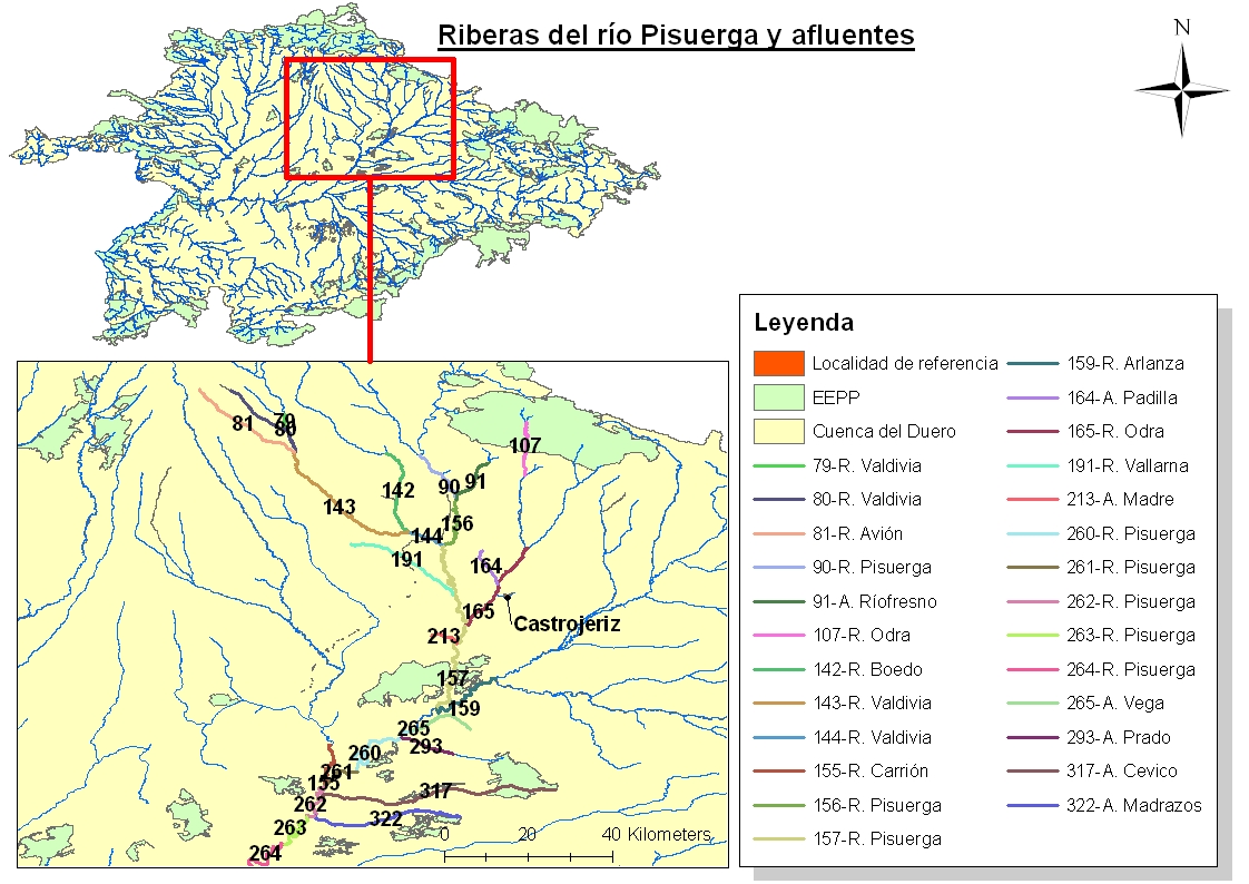 El Lugar incluye varios tramos fluviales que cuentan con buenas poblaciones de distintas especies de peces continentales. Destacan los hábitats fluviales, en especial los bosques galería de sauces y álamos. Desde un punto de vista hidrológico el Espacio comprende parte del río Pisuerga y varios afluentes, el Valdavia, Boedo y Odra, en el tramo comprendido dentro de este Espacio el río Pisuerga recibe a dos de sus afluentes más importantes el Carrión y el Arlanza, pero estos dos ríos forman parte de otros Espacios protegidos. El corredor fluvial protegido, está interrumpido en parte, la cabecera del río Pisuerga pertenece a otro Espacio protegido, Fuentes Carrionas y Fuente Cobre-Montaña Palentina, y existe un tramo entre este Espacio y el que tratamos aquí, que no está incluido en ningún LIC.