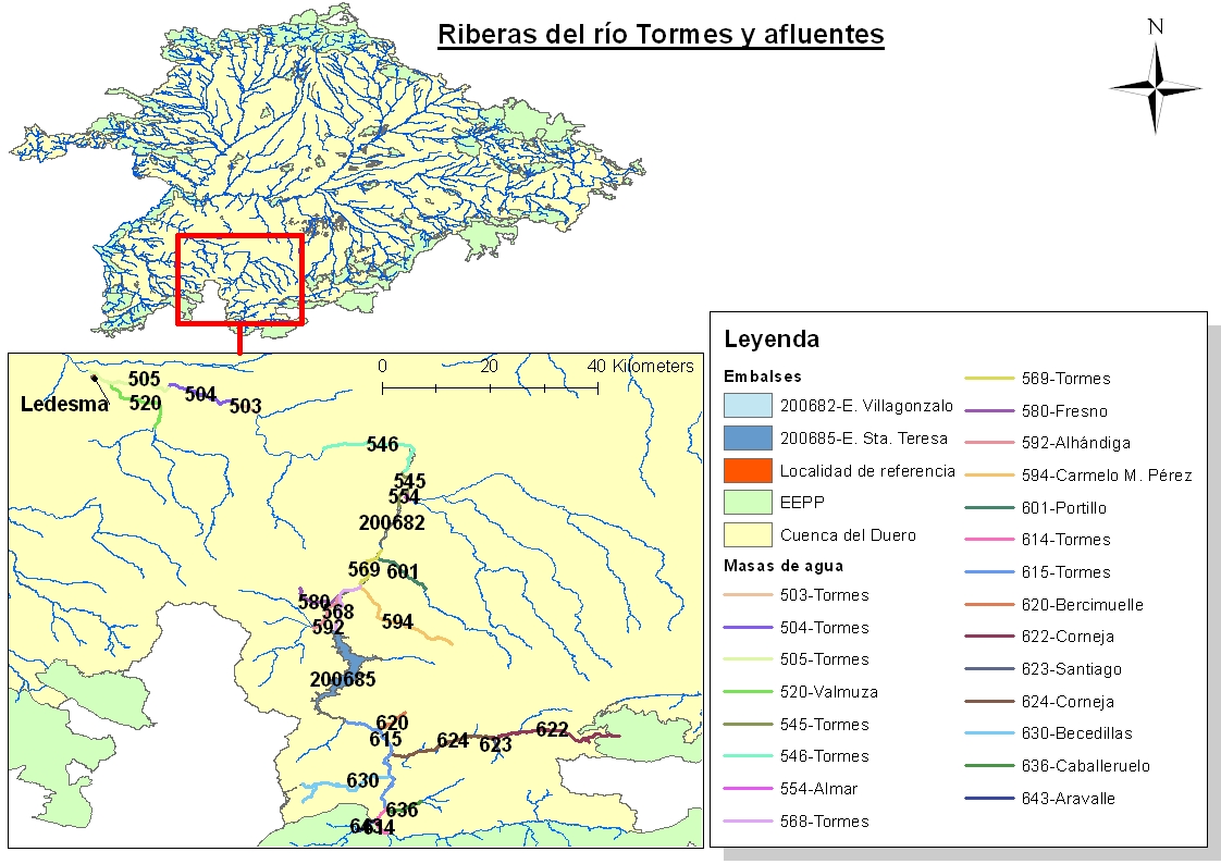 Este Espacio tiene tres partes diferenciadas: el segmento alto del río Tormes que incluye el tramo del río Tormes desde la localidad de El Barco de Ávila hasta la cola del Embalse de Santa Teresa próximo a la localidad de Cespedosa de Tormes, incluyendo los afluentes: el río de la Corneja y el río de Becedillas. Un segmento medio, que incluye dos tramos del río Tormes separados por el Embalse de Villagonzalo, no incluido en el LIC, este segmento medio comprende desde el final del Embalse de Santa Teresa hasta la localidad de Huerta. Y el segmento situado más aguas abajo del río Tormes, que empieza en la localidad de Valverdón hasta la localidad de Ledesma, aguas abajo de este Espacio se encuentra el Embalse de la Almendra.